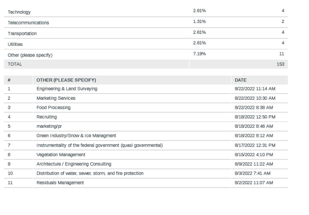 In 2022, ATW partnered with the Iowa SHRM State Council and the Central Iowa Chapter of the Association for Talent Development (ATD) to ensure that the Iowa talent development and business communities were well represented in the survey. 153 respondents from 32 industries completed this year’s survey.